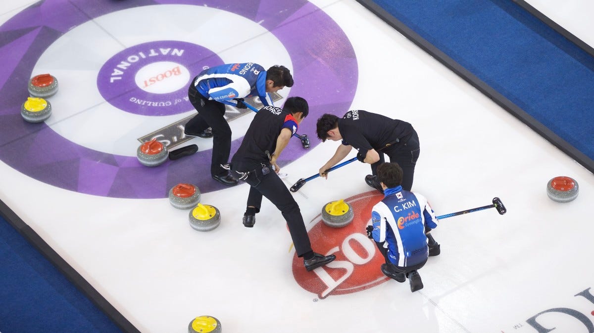 In light of Loland and Bäckström’s theory, curling is an unusual glidesport, because the friction and the gliding, the effortful and the free motion, occur at the same time. Curlers slide a smoothed and bevelled chunk of Ailsa Craig granite down an ice sheet, aiming for the concentric target (‘the house’) at the far end. The stone moves with the curl imparted by its thrower, but also by the concerted efforts of two sweepers, anxiously attending to the stone as it travels down the sheet, scrubbing around it frantically to speed the stone up or influence its direction. The stone and the curlers don’t fuse, like a skater to his skates or a rower to her oars; they move in disjointed parallel, the smooth silent stone and the frantic yelling persons. There’s something comic about this disjunction, and about curling as a whole – the impassioned yelling of commands, the sweepers scrubbing like apprehensive workers upstage in a musical – but something beautiful too. In this glidesport, unlike most others, what moves smoothly is not a human body but a heavy and cumbersome object made elegant by concerted human effort.